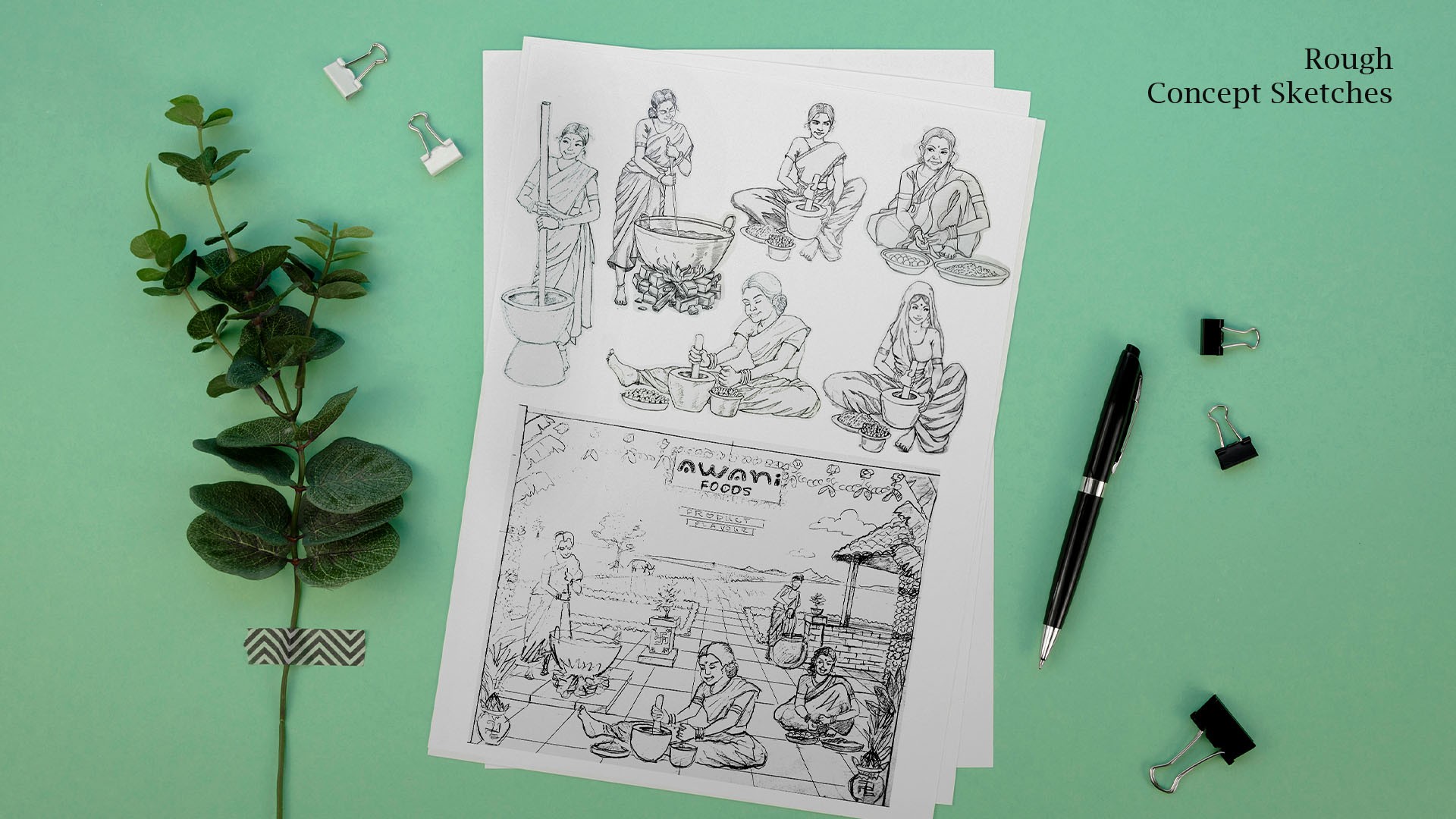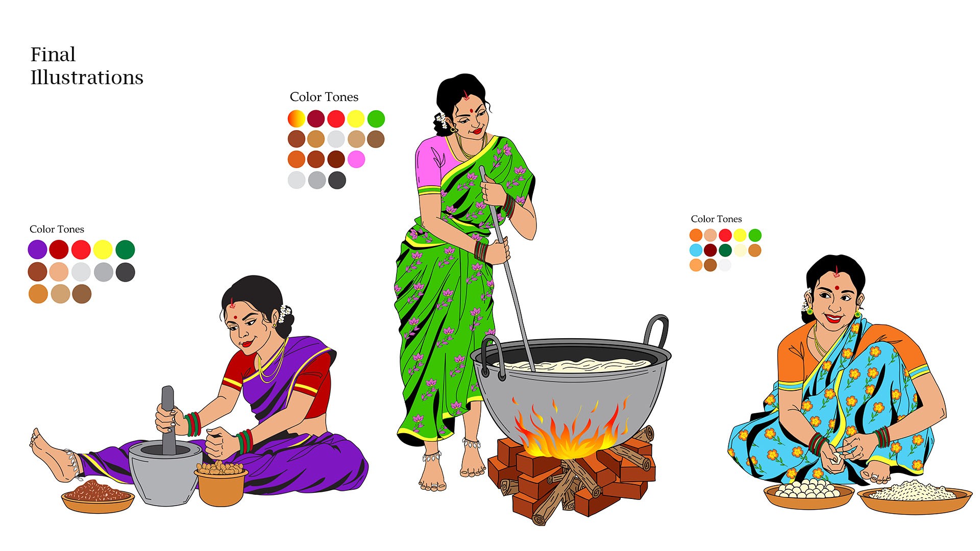 To meet the client’s goal of appealing to mid-level and premium Indian consumers, I created label illustrations that highlight the traditional, organic methods used by women in Kerala to grind spices. These designs blend authenticity, craftsmanship, and heritage, ensuring the packaging feels both culturally rich and refined to resonate with health-conscious, sophisticated buyers.