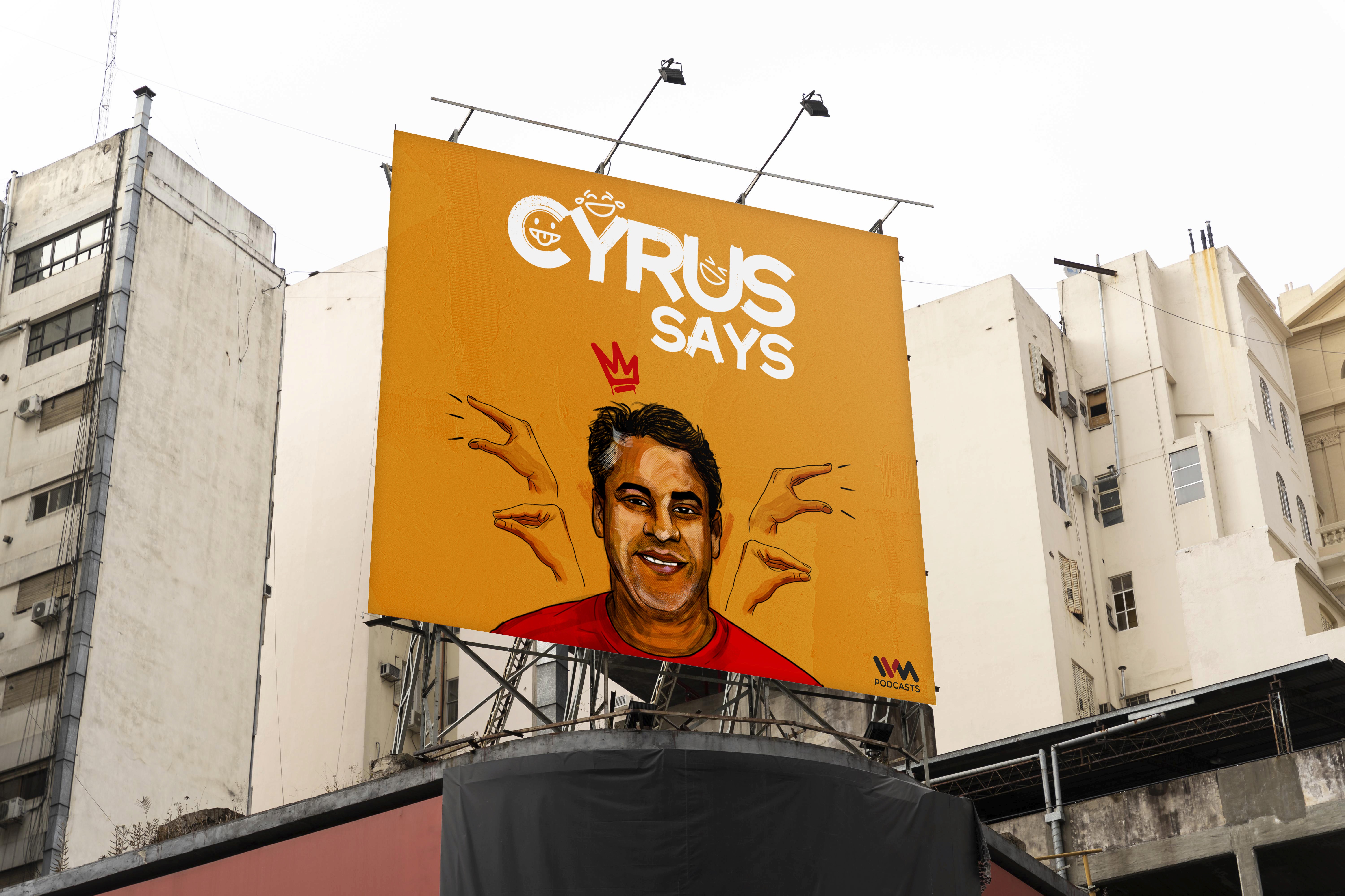 For 'Cyrus Says' — a definitive podcast on urban Indian life, politics, sports, and everyday quirks — I captured the host’s playful, outspoken personality through digital portrait paired with bold, fun graphic elements. The bright palette and expressive illustration style bring humor and energy to the artwork, perfectly echoing the show’s candid, witty tone and appeal to a contemporary urban audience.