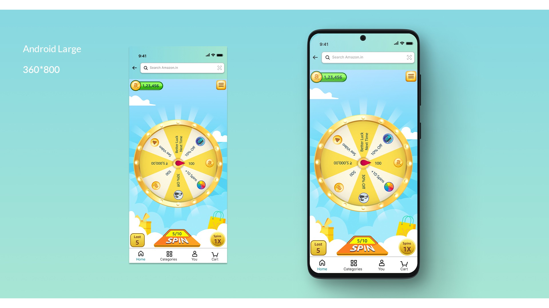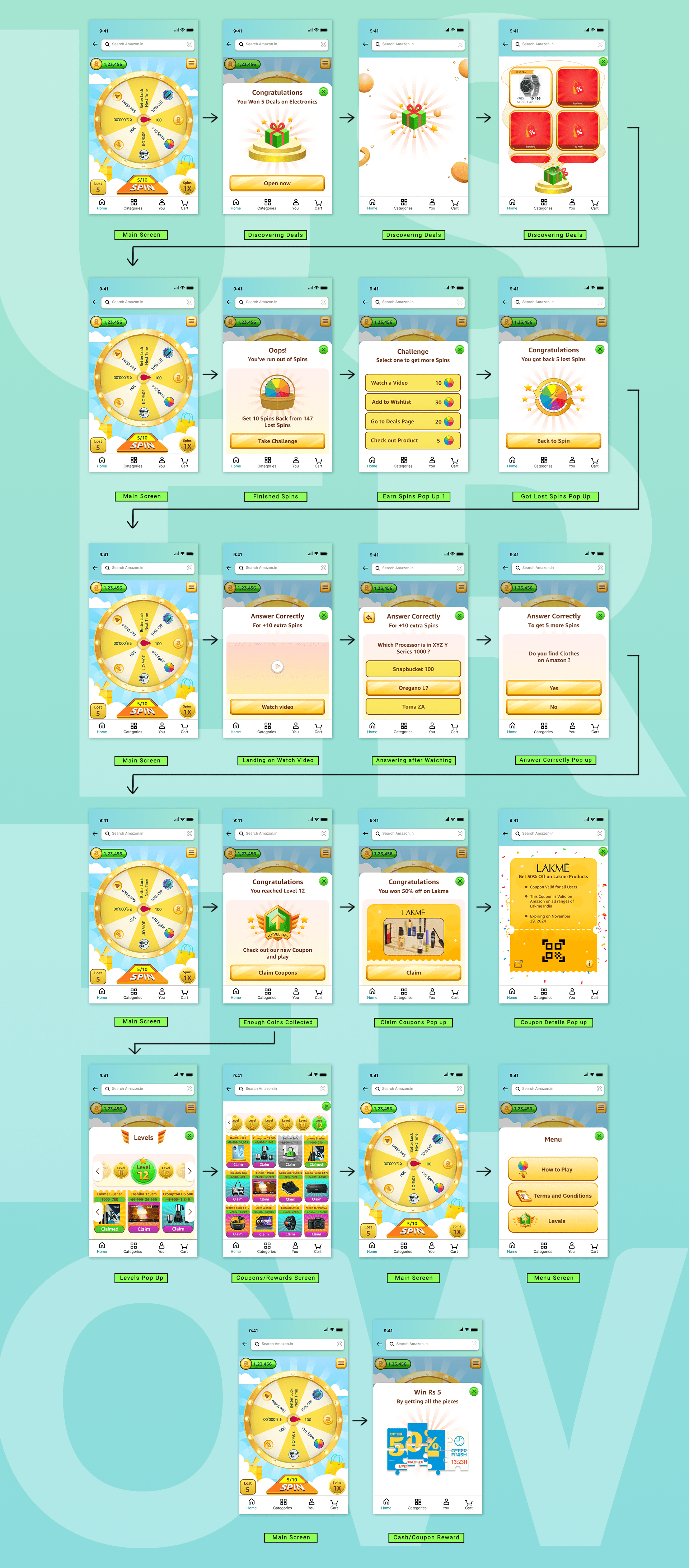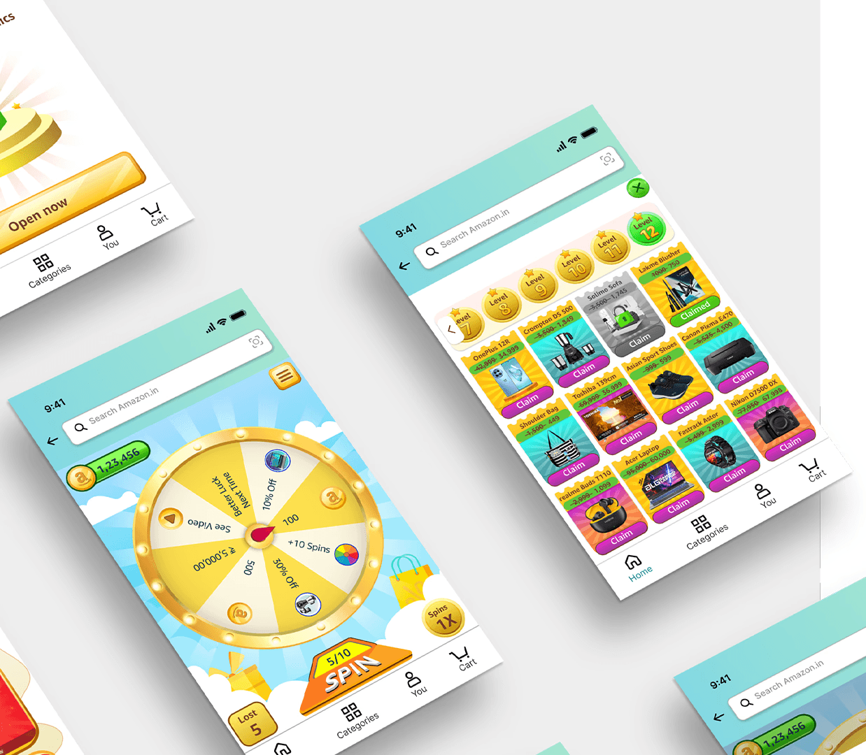 To increase engagement beyond a single-day spin, I proposed evolving the existing Spin & Win into a multi-day, multi-spin experience inspired by popular casual games like Pirate Kings and Monopoly Go. By blending familiar game mechanics with shopping activity, the solution helps customers earn rewards and coupons while naturally exploring and interacting with the Amazon app